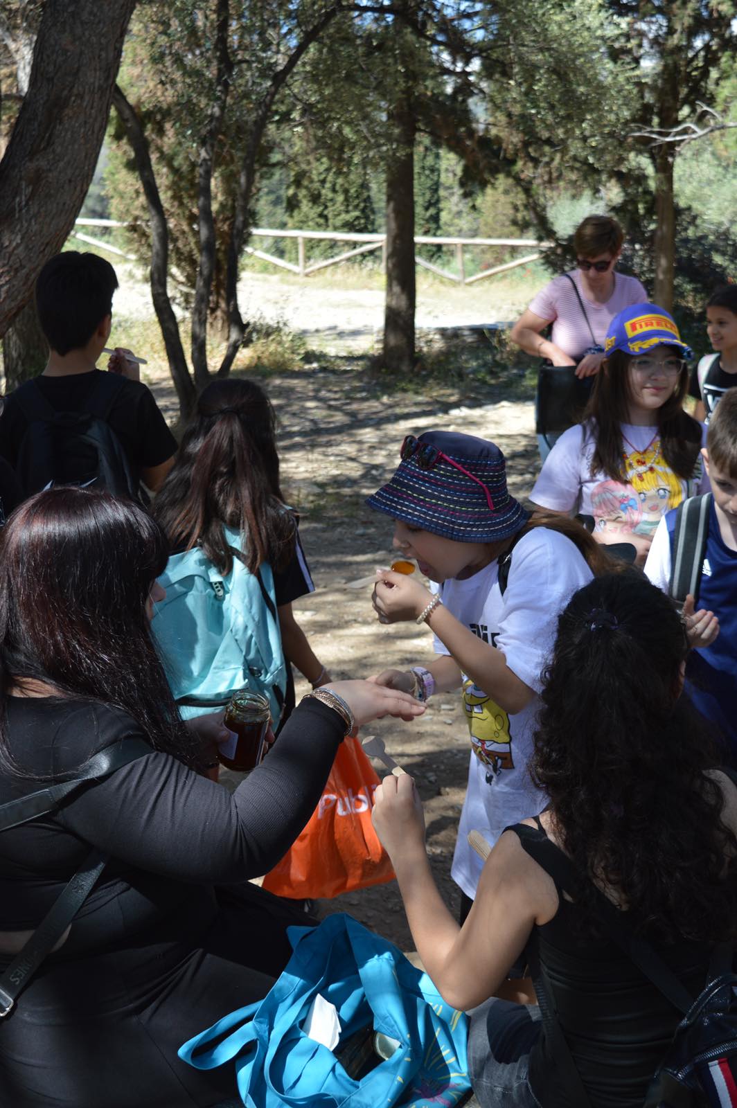 Στη συνέχεια περιηγηθήκαμε από την ξεναγό μας στα μονοπάτια του δάσους που οδηγούσαν στο φραγκομονάστηρο και στη διαδρομή γνωρίσαμε φυτά όπως το κυπαρίσσι και τον αρωματικό σχίνο . Τέλος καταλήξαμε στο ξέφωτο όπου γευτήκαμε το περίφημο μέλι Υμηττού και φωτογραφηθήκαμε με φόντο το λεκανοπέδιο .