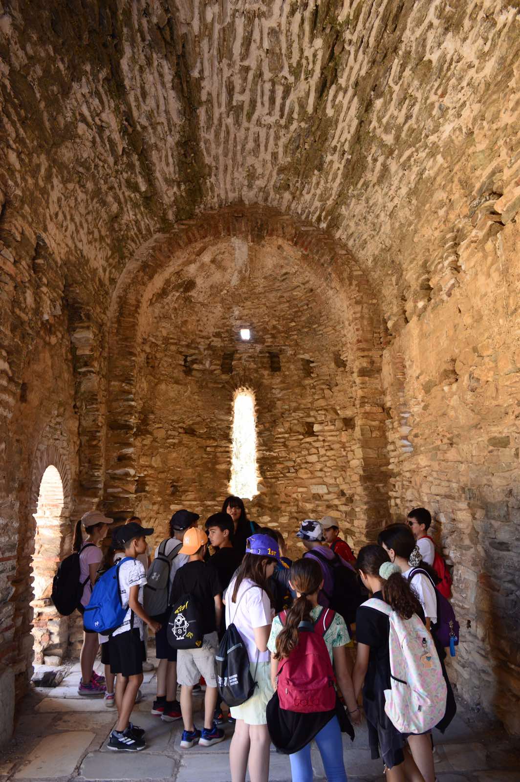 Τον Μάιο η Ε τάξη ξεναγήθηκε στο βυζαντινό μοναστήρι της Καισαριανής που χτίστηκε τον 11ο αι. μ. Χ. και αποτελεί μοναδικό μνημείο αυτού του πολιτισμού στο λεκανοπέδιο της Αττικής . Θαυμάσαμε την αρχιτεκτονική του , τις τοιχογραφίες , γνωρίσαμε τον μοναστικό τρόπο ζωής αλλά και την καθημερινή ζωή των βυζαντινών. Οι κήποι του μοναστηρίου ήταν ολάνθιστοι με το ιστορικό φυτό «άκανθα» που το φύλλο της ενέπνευσε το κορινθιακό ρυθμό στα κιονόκρανα της αρχαιότητας .